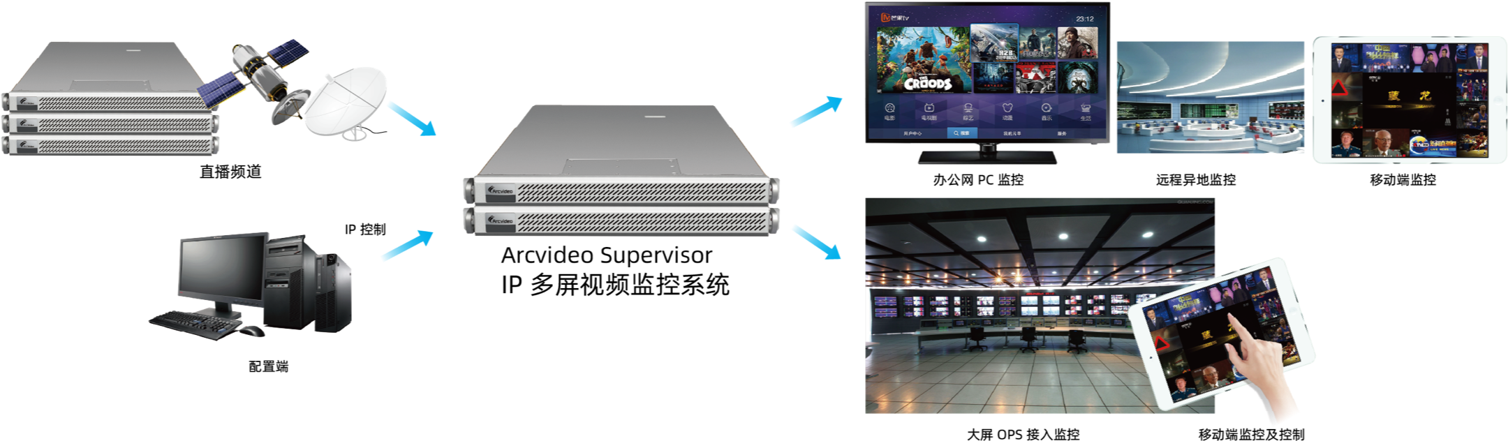 Arcvideo Supervisor IP 多屏视频监控系统,主要服务于电视台、 IPTV、有线网络、互联网视频等行业用户,通过对链路中不同节点的 直播信号进行回传,实现全链路信号监测和视频内容监控,可用于控制室、指挥中心、调度中心等各类有音视频信号和图像内容监测监控需求的综合应用场景。本系统基于业内顶级视频处理算法设计,支持对实时流进行监控监测,可对监控画面进行任意组合、拼接和布局设置,同时提供 iPad 实时监看业务,支持通过OPS设备将拼接画面输出到大屏显示。
