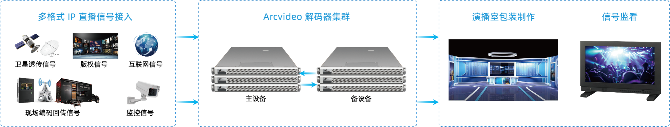 Arcvideo Decoder 是基于实时流的广播级专业 解码器,兼容高标清及 4K/ 8K 格式的 解码,主要针对各级电视台、新媒体、互联网视频和电信运营商等需要解码监看或进演播室包装的用户,为其提供高稳定、低延时、 超高清化的解码解决方案。该解码器支持多协议多格式 IP 流以及 ASI 输入信号的解码,支持高标清 SDI 接口以及 3Gx4、12G、12Gx4、ST 2110 等超高清接口输出,支持 HDR 及 三维声格式,适用于高度还原原始画质或音频的应用场景,支持毫秒级低延时机制,支持不稳定网络场景下的缓存解码机制,为用户提供稳定的解码能力。