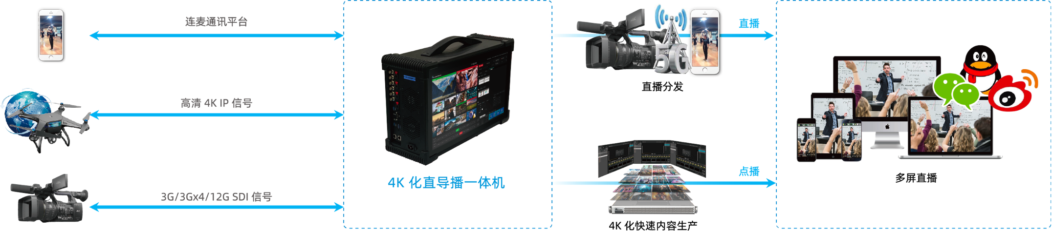 Arcvideo Director 直导播一体化系统,是一款集 直播信号接入、内容制作、导切输出、云端发布于一体的内容生产制作系统,本产品结合 Arcvideo 多年的音视频技术积累和 视频云平台运营经验,运用多格式信号接入、多机位切换、信号录制、信号监视、图文叠加、调音、特效变换、导播输出、 4K HDR 处理、低延时连麦等技术,为广电新媒体运营、在线教育、互联网用户、政府企业等提供一站式的直导播解决方案。